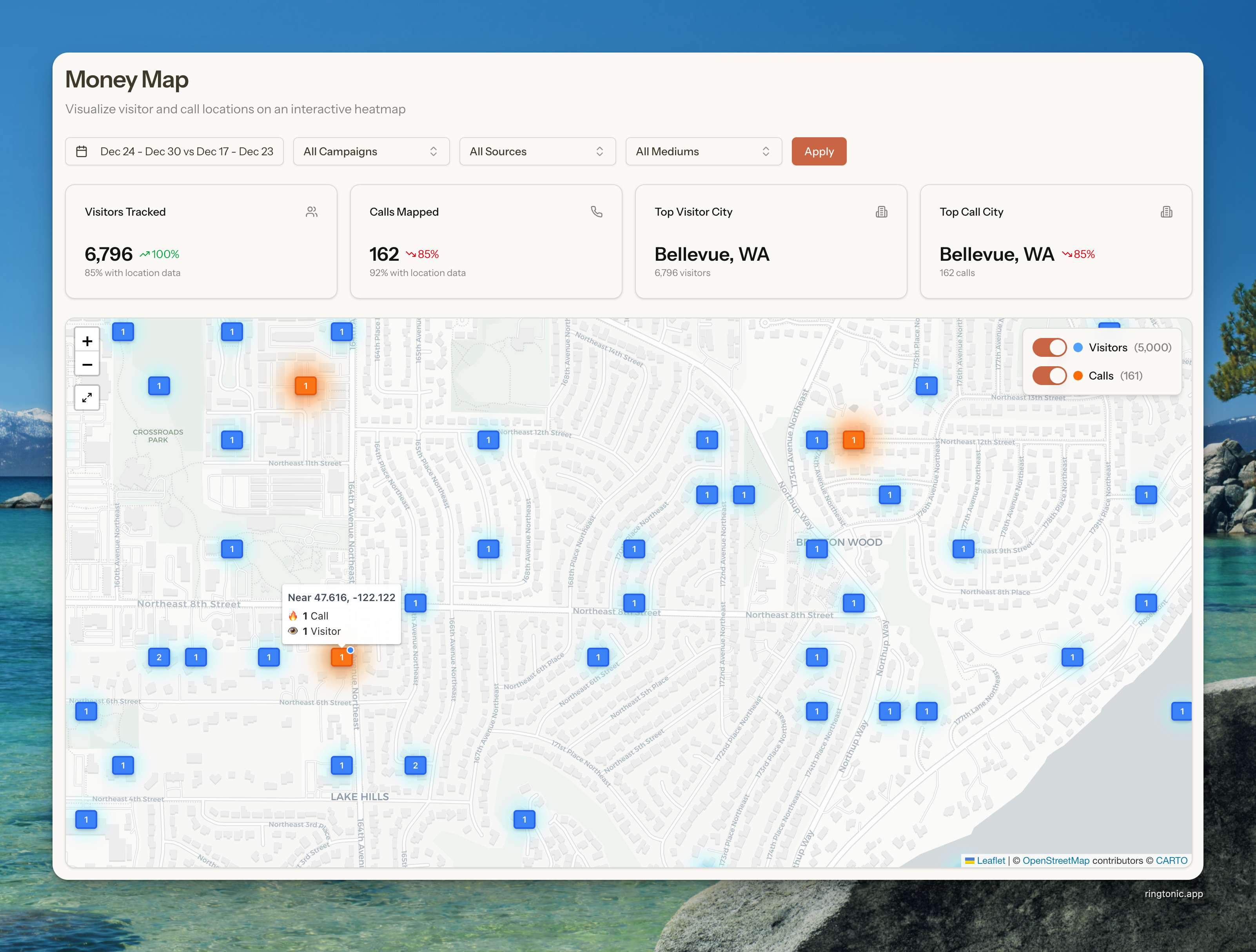 Money Map visualizes where your visitors and callers are located on an interactive heatmap. Identify geographic hotspots, discover underserved areas, and understand the spatial distribution of your leads.