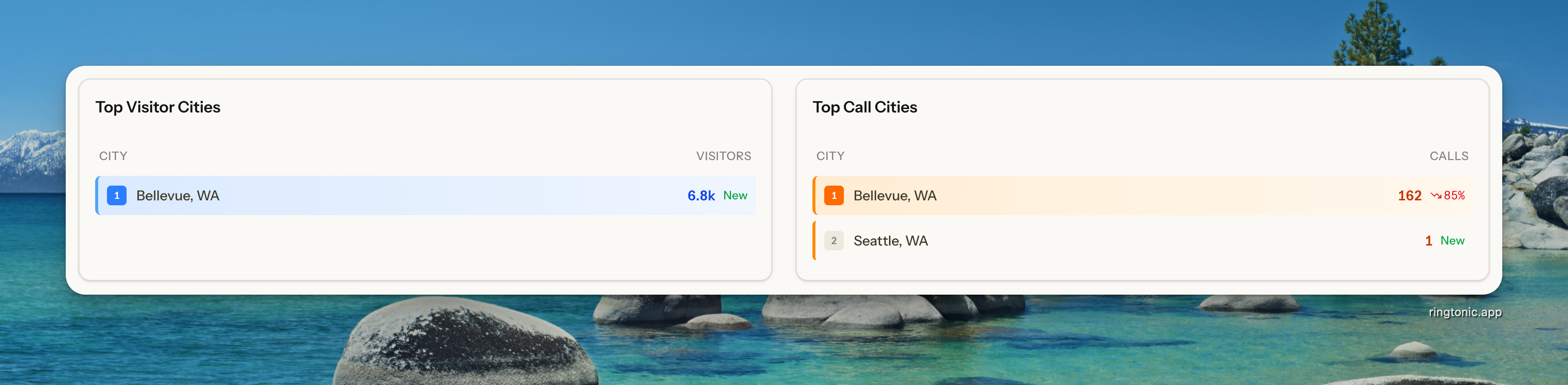 Below the map, two tables show your top 10 cities by visitor count and call count, making it easy to identify your strongest geographic markets.
