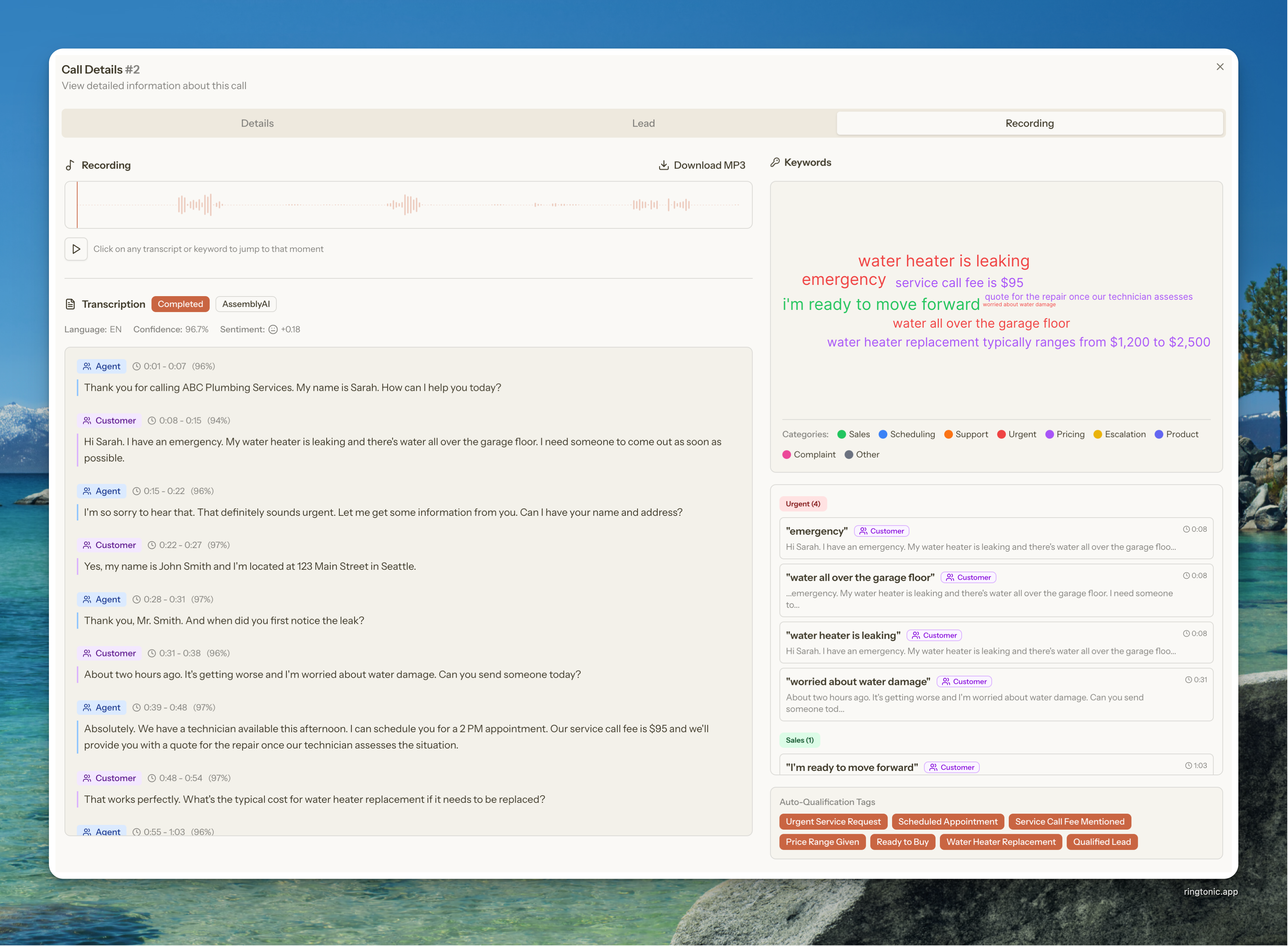 * **Recording** - Call recording playback, transcription with speaker labels, sentiment analysis, keywords, and AI summary