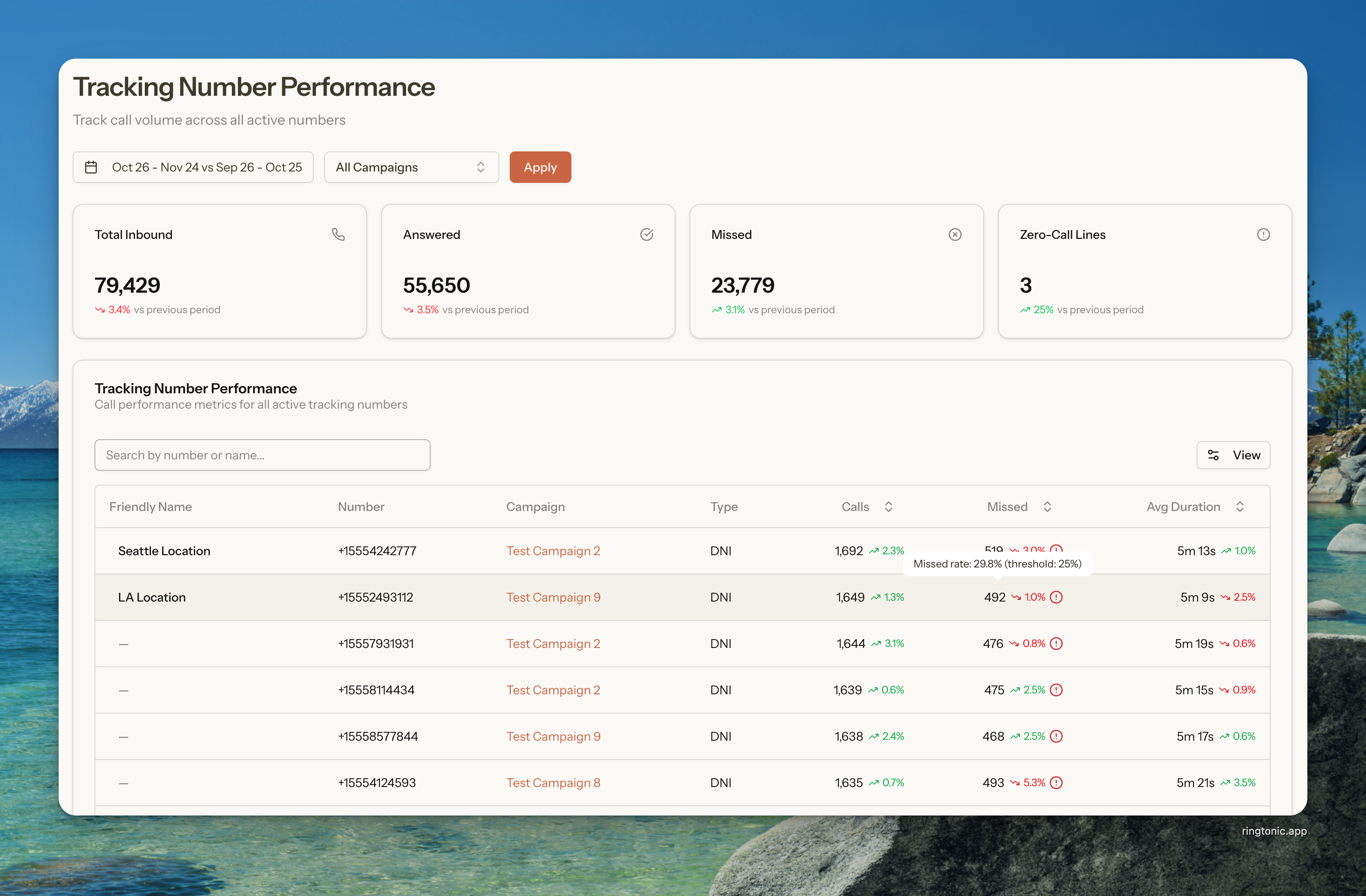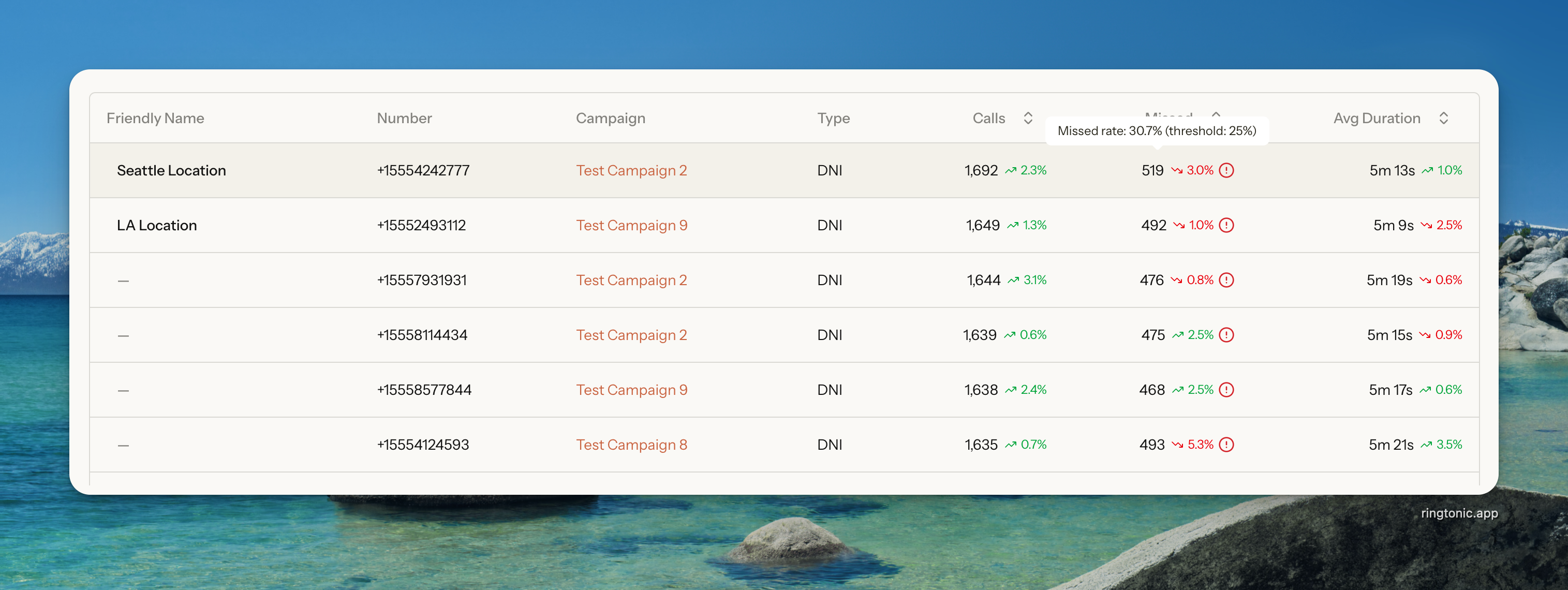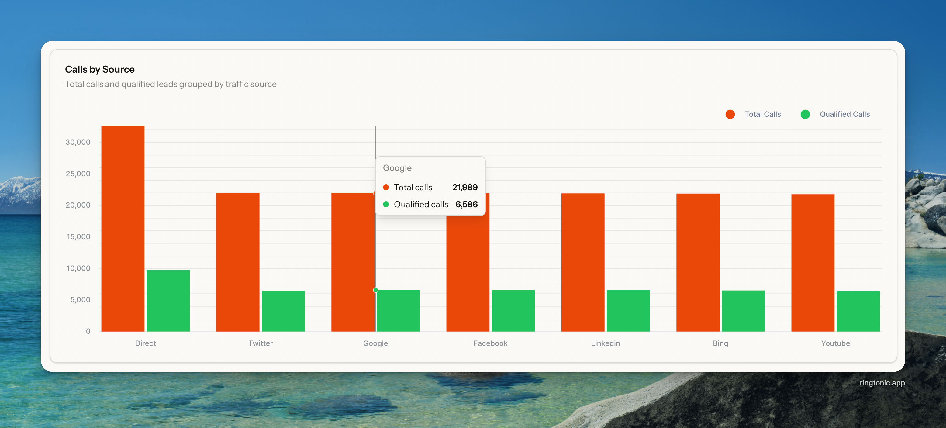 Ring Tonic provides powerful analytics to help you understand your call tracking performance and marketing ROI. Get a true bird-eye view of all your calls across every campaign, making it super easy for lead-gen teams to quickly see which areas are generating the most calls and which ones are underperforming.
