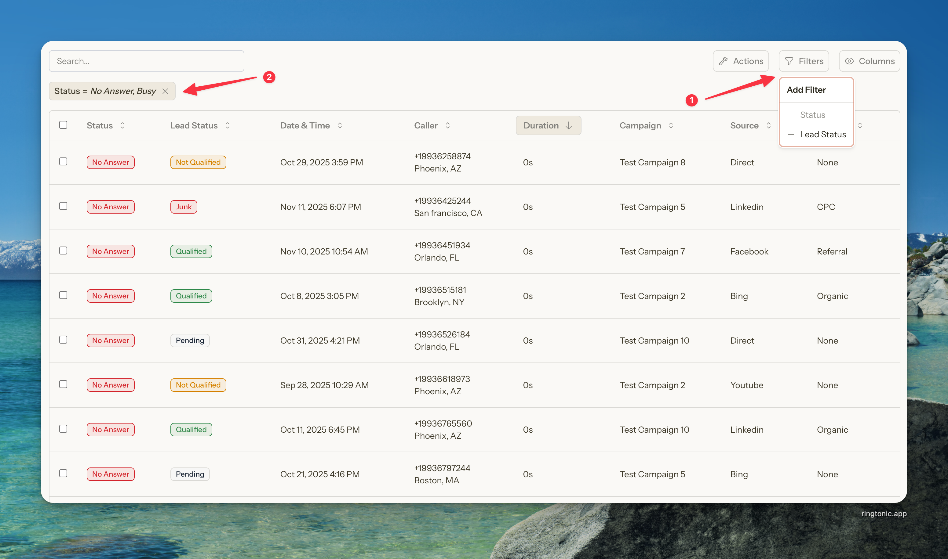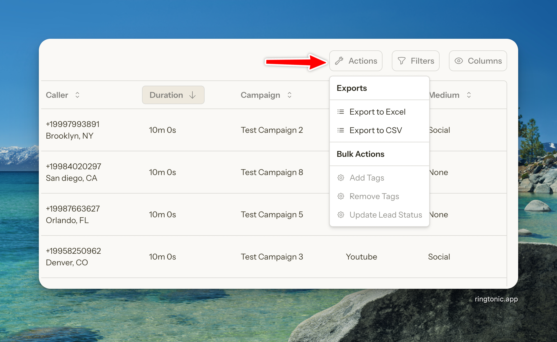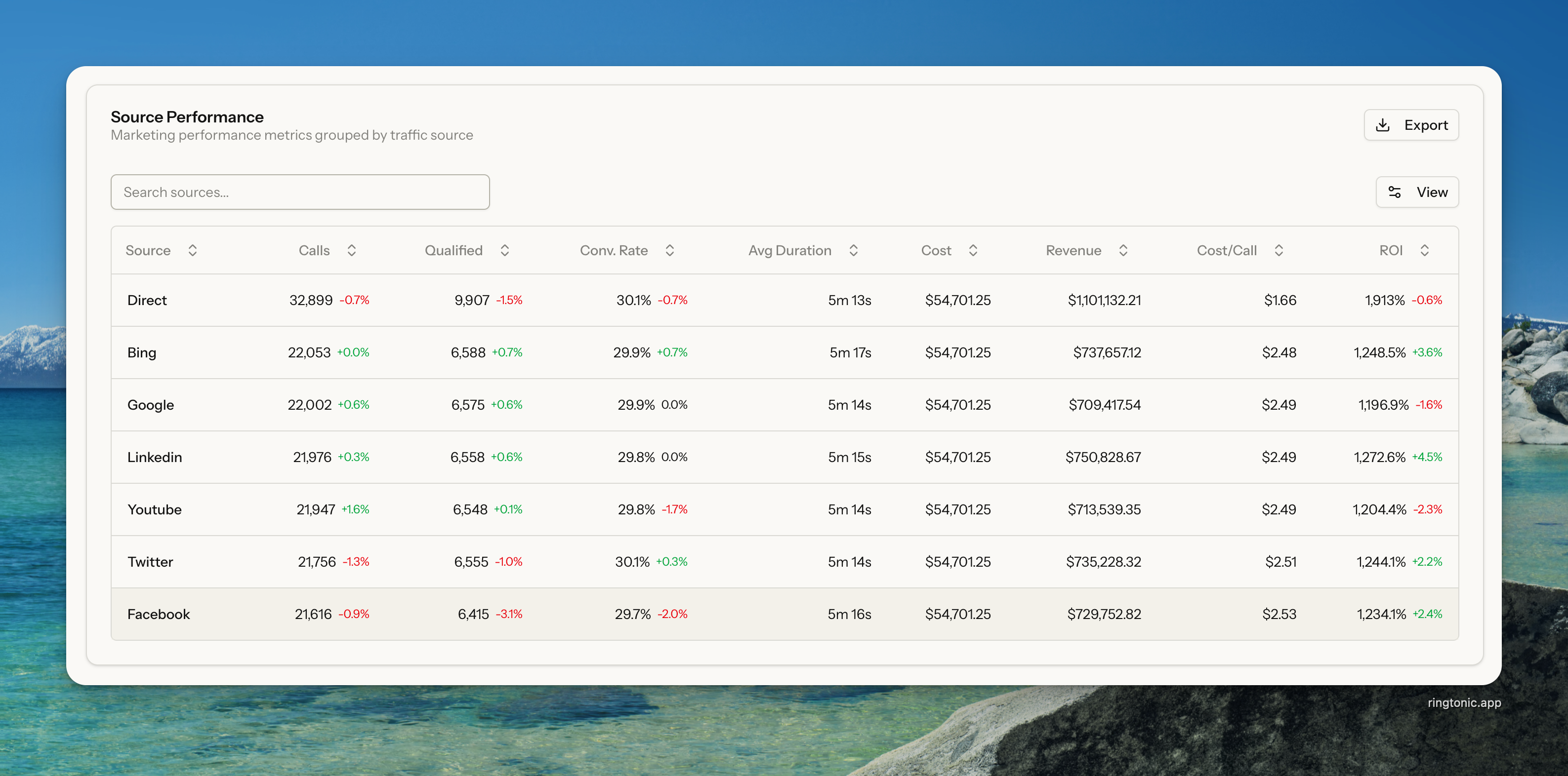 Ring Tonic provides powerful analytics to help you understand your call tracking performance and marketing ROI. Get a true bird-eye view of all your calls across every campaign, making it super easy for lead-gen teams to quickly see which areas are generating the most calls and which ones are underperforming.