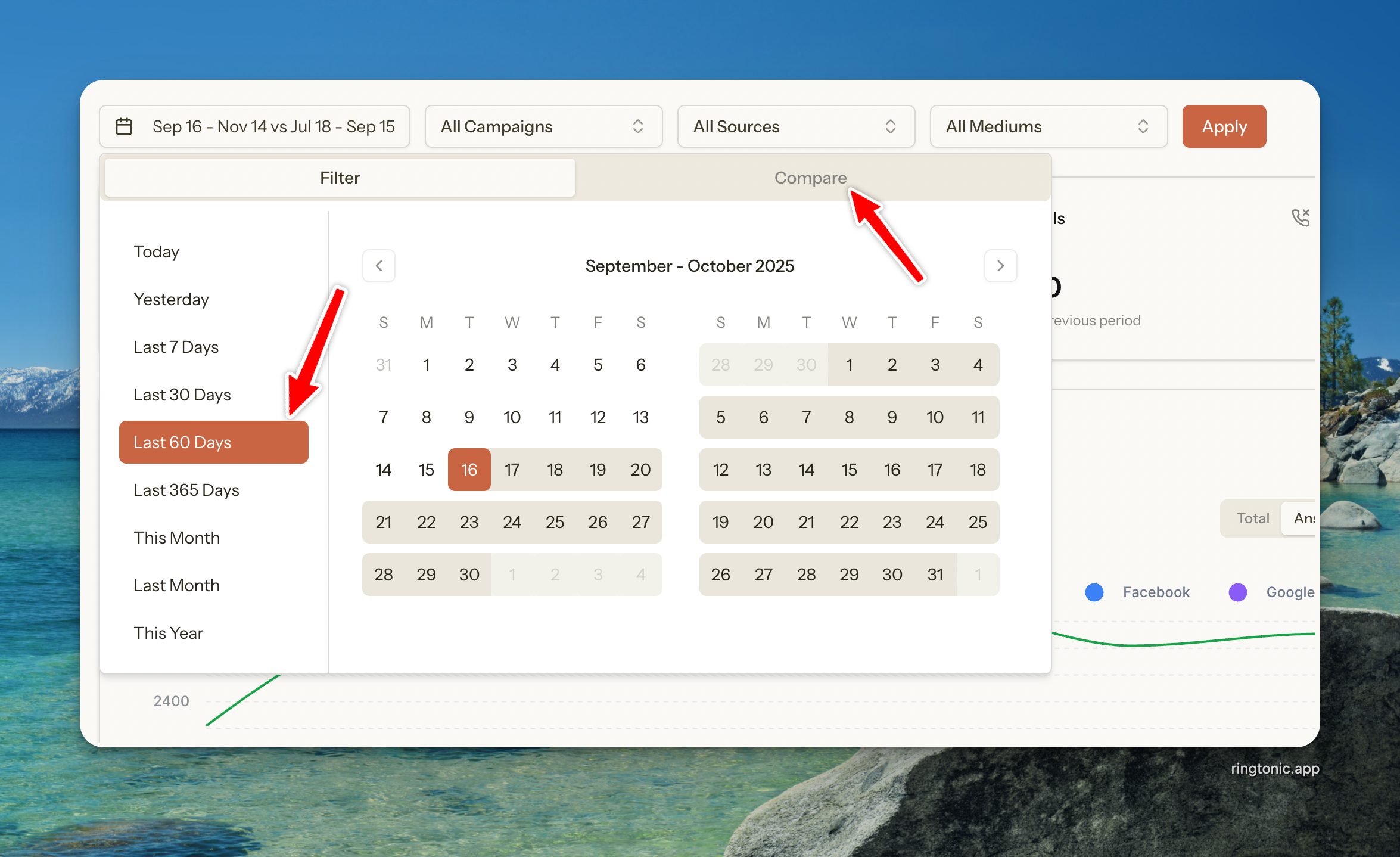 2. Choose a preset (Last 7 Days, Last 30 Days, Last 60 Days) or select custom dates
