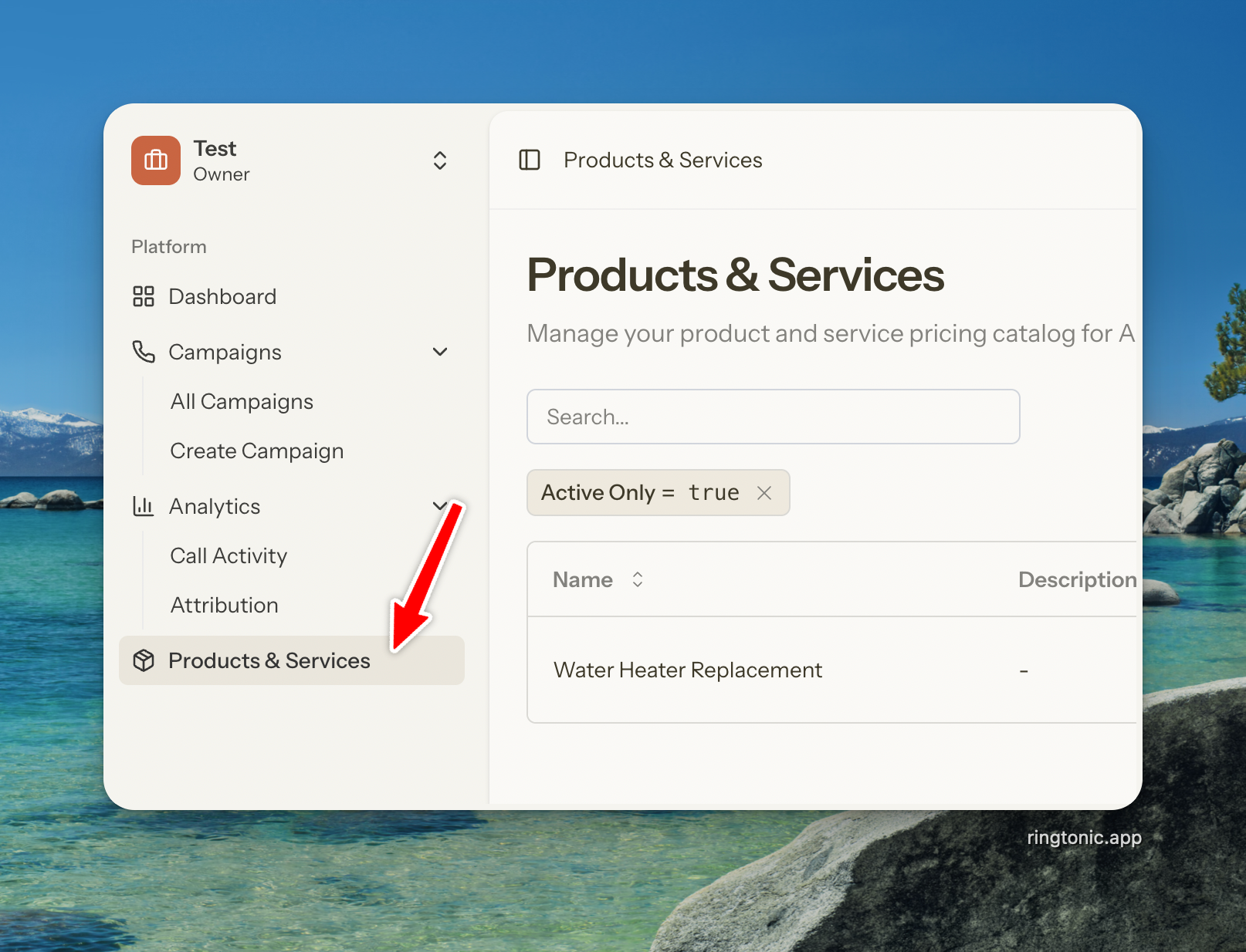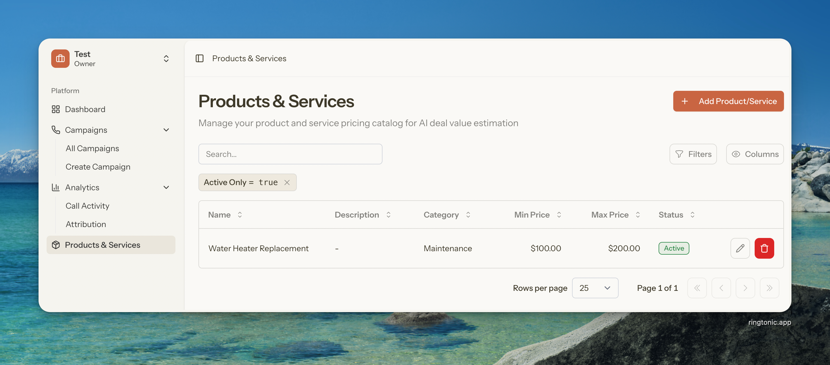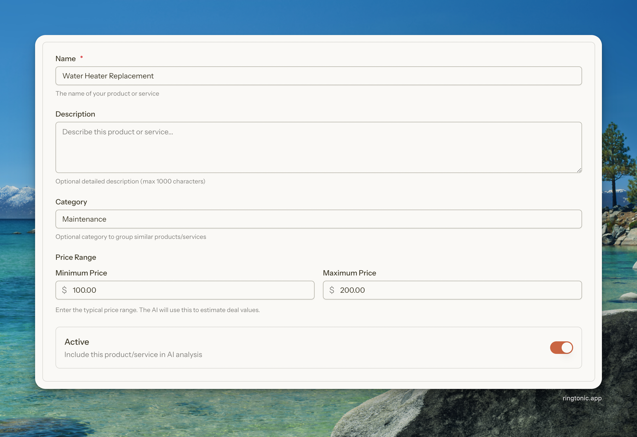 The Products & Services catalog is your pricing menu that powers AI-driven deal value estimation. By maintaining a catalog of what you offer and how much it costs, Ring Tonic's AI can analyze customer calls and automatically estimate potential revenue for each lead.